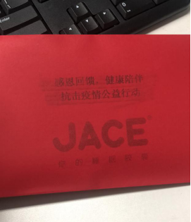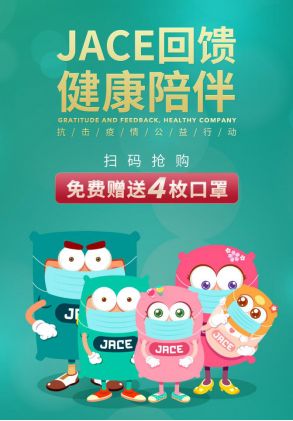 2月25日,JACE在线上发起了抗疫公益行动,公众扫码参与就能免费获赠4枚口罩,在支援一线的同时,也同样心系着广大群众的需求,希望能够适当缓解民用口罩紧缺的状态,让健康陪伴客户,回馈大众。