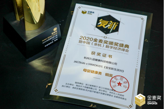 12月23日,2020金麦奖颁奖盛典暨中国(余杭)数字经济峰会在浙江杭州艺尚小镇国际秀场隆重举办。颁奖盛典上,“JACEkids x HIMOKIDS‘宝宝新生派对’跨界联合营销”荣获2020金麦奖母婴健康类案例大奖。