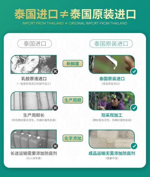 原液进口不等同于原装进口乳胶,如今乳胶市场鱼龙混杂,许多使用进口原液的商家会有意模糊视线,让消费者误以为产品是原装进口。事实上,天然乳胶若不搅拌,静止一段时间后就会凝固变质,那原液长途运输进口靠什么来保鲜?靠的是添加氨水,氨水有毒且有刺激性气味,为掩盖其气味大多数商家会选择添加化学香精。