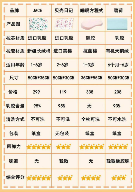 宝宝的睡眠健康与一个合适的枕头密不可分,不同年龄的孩子需要的枕头软硬程度、高度和形状都不同。在宝宝的成长发育阶段,宝妈们需要根据宝宝的情况选择枕头的形状和大小。本次测评的四款枕头中,睡眠方程式为云朵状的异形枕,其余JACE、贝壳日记、碧荷均为长方形枕。一般而言,睡觉多动的宝宝建议选择中规中矩的枕型,偏离枕头、落枕的几率会小一点。
