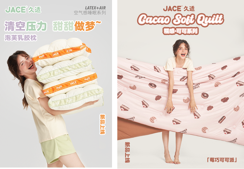 进入2023年的秋冬季,JACE带来两大全新产品系列——LATEX+AIR空气感睡眠系列与全新冬被品类,涉及三大突破点——概念突破、品类突破、材料突破。JACE秋冬新品研发基于床品基础的舒适属性外,在外观和产品材质上着重强调产品带给用户的治愈力。软萌舒适的床品不仅实用,更具有审美价值与治愈属性,给用户带来体感上的舒适和心灵上的放松。
